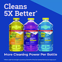 - ✔This 2X concentrated formula makes 2X more cleaning solution than previous Pine-Sol® scented formula ✔This scented formula now cleans 5X better when used full strength versus the previous Pine-Sol® scented formula on soap scum ✔This multipurpose cleaner cleans without leaving a sticky residue and is safe for use on stainless steel, vinyl, laminate, linoleum, chrome and more ✔Cuts through tough grease, grime, dirt and soap scum while leaving behind a classic fresh scent ✔One bottle of reduces plastic waste by 50% compared to previous Pine-Sol® 144 oz bottle ✔ Case of 3 bottles of 80 oz. makes 240 gallons of ready to use product for all purpose cleaning ✔ 1 bottle of 80 oz. makes 80 gallons of ready to use product for all purpose cleaning